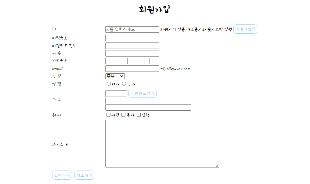 회원 기본 정보 아이디 4~12자의 영문 대소문자와 숫자로만 입력 비밀번호 4~12자의 영문 대소문자와 숫자로만 입력 비밀번호 확인 메일 주소 예) id@domain.com 이름 개인 신상 정보 주민