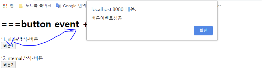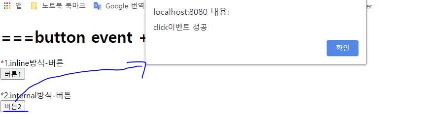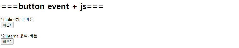 <input type="button" value="버튼1" id="btnClick" onclick="javascript:alert('버튼이벤트성공')"> <br><br>